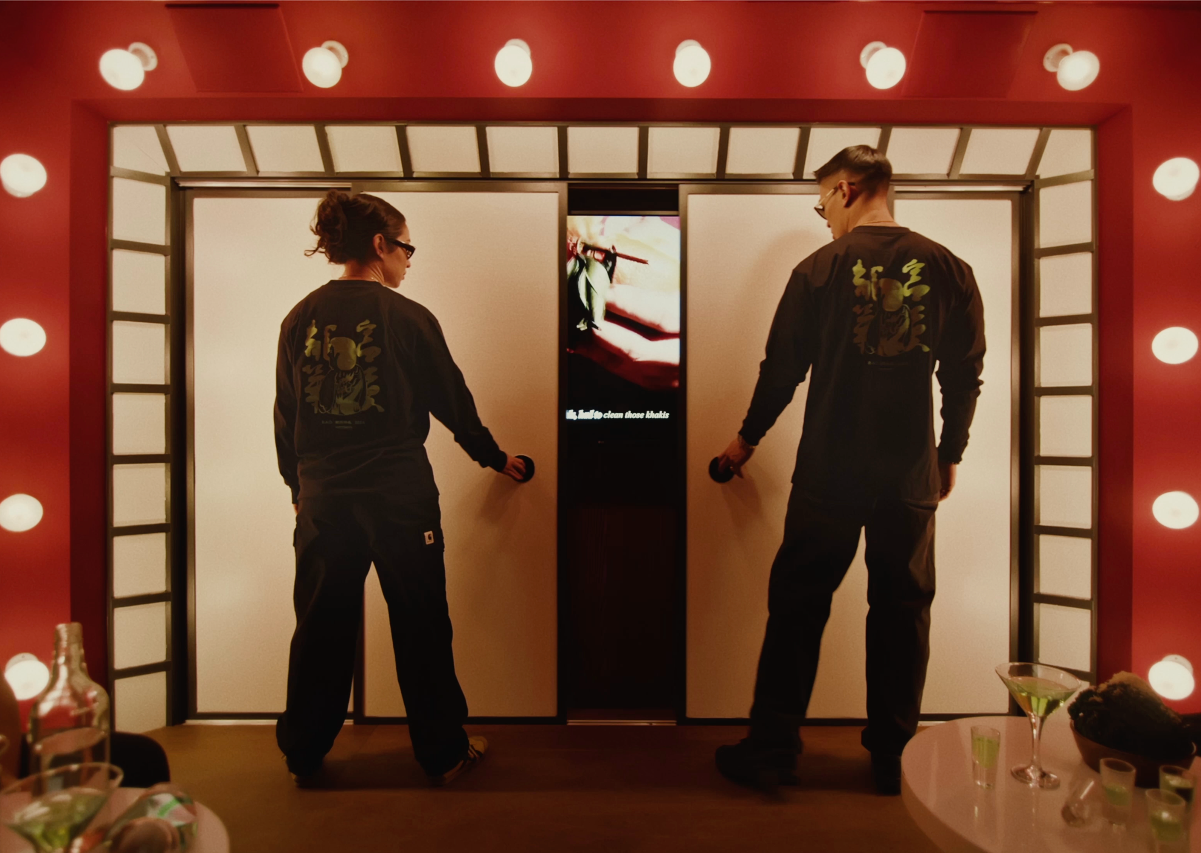 In the basement of BAO Marylebone is a romantic private karaoke room inspired by In The Mood for Love by Wong Kar Wai. Red draped curtains, neon signs, checkered floors.