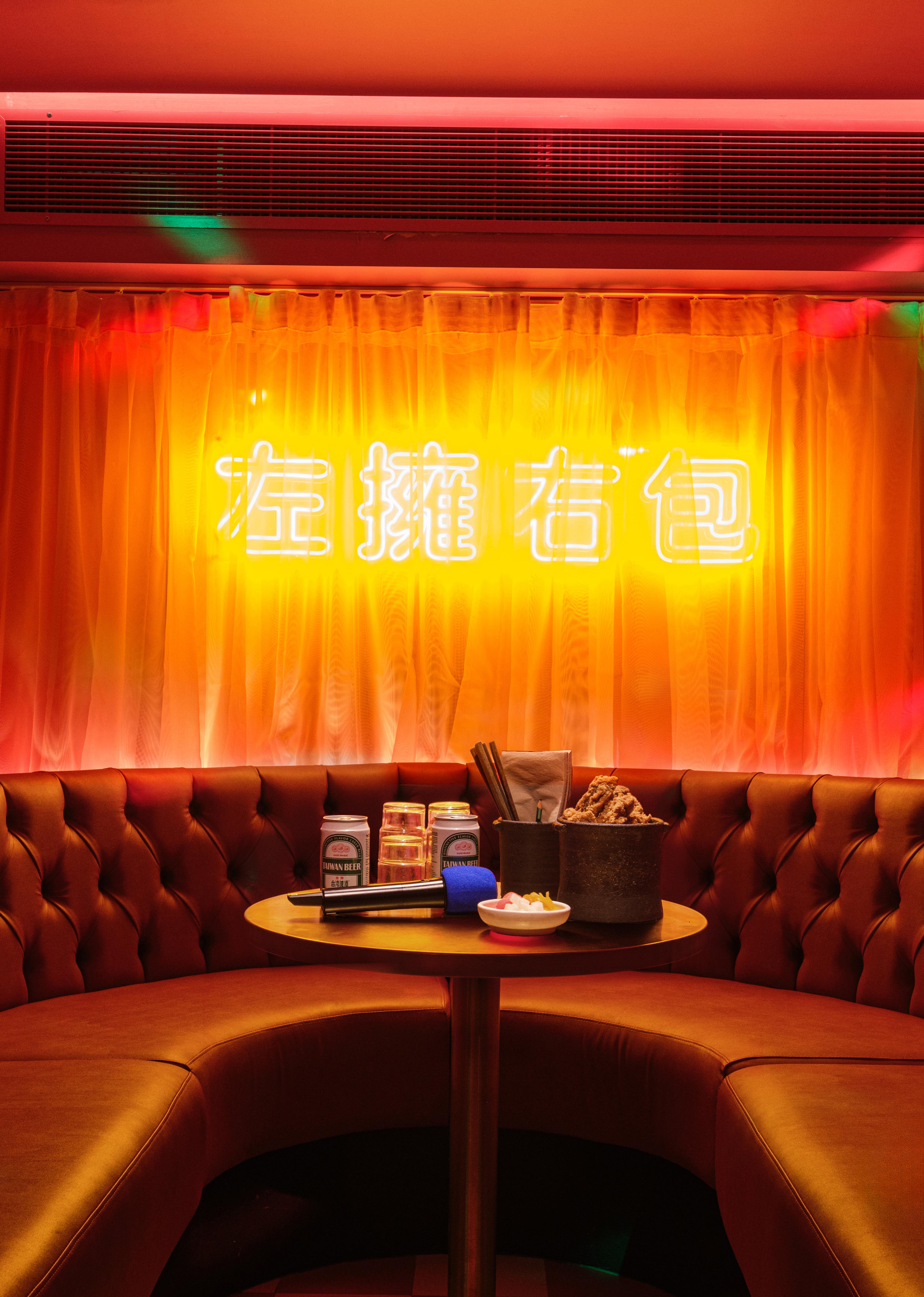 The red room, horseshoe leather banquette, neon sign sitting and wavy red curtain drapes. A KTV system with 300,000+ Songs, and a digital order screen to order food and drink